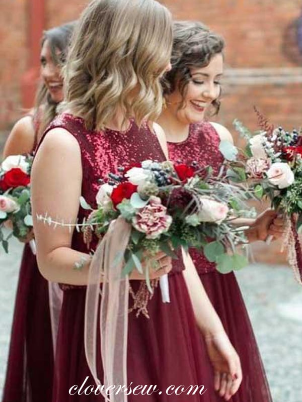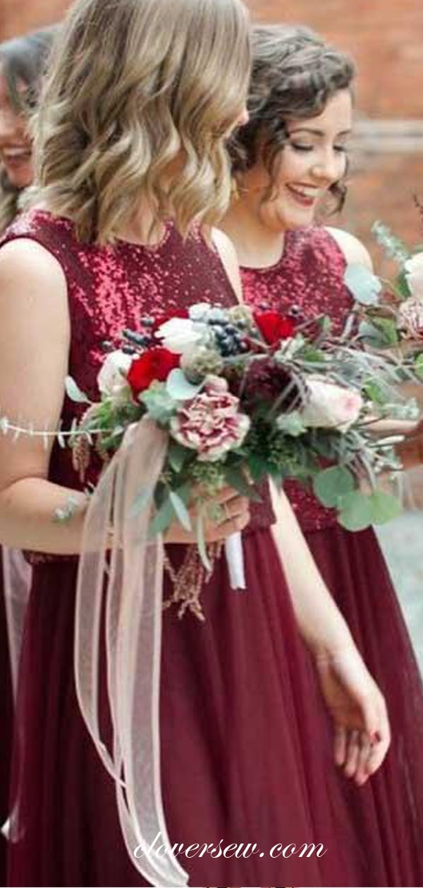 Two Piece Bridesmaid Dresses,Burgundy Sequin Bridesmaid Dresses,A-line Bridesmaid Dresses,CB0036