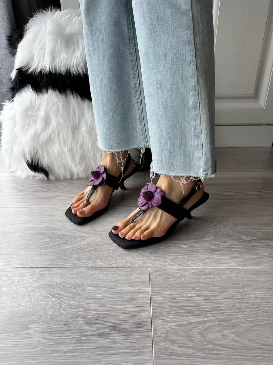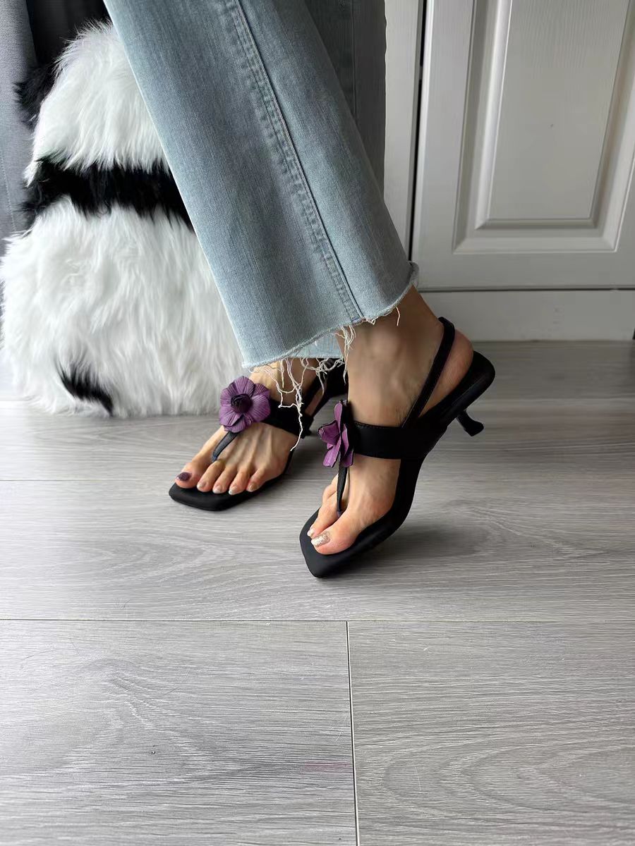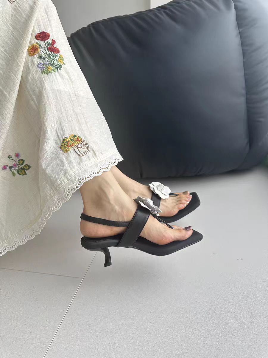 Black Handmade Flower Flip-Toe Stiletto Leather Sandals