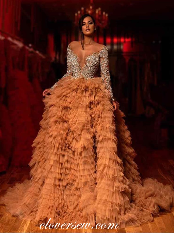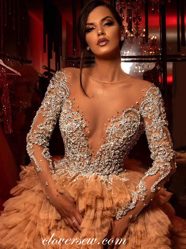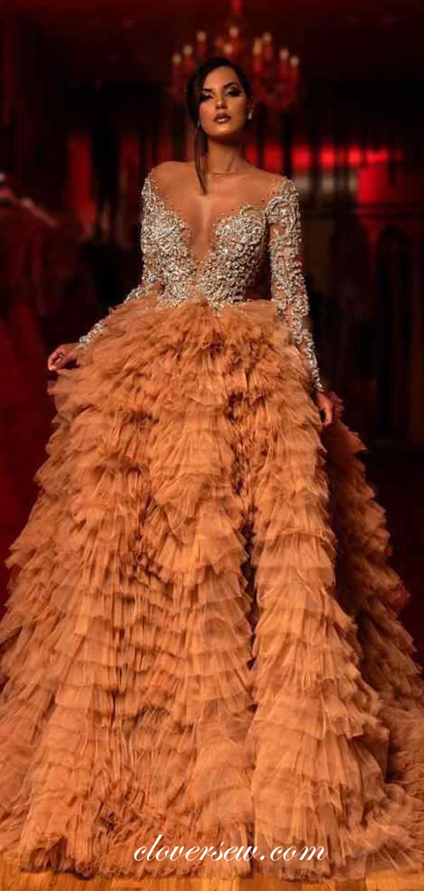 Gorgeous Bead Prom Dresses,Long Sleeves Prom Dresses,Tiered Tulle Prom Dresses,CP0027