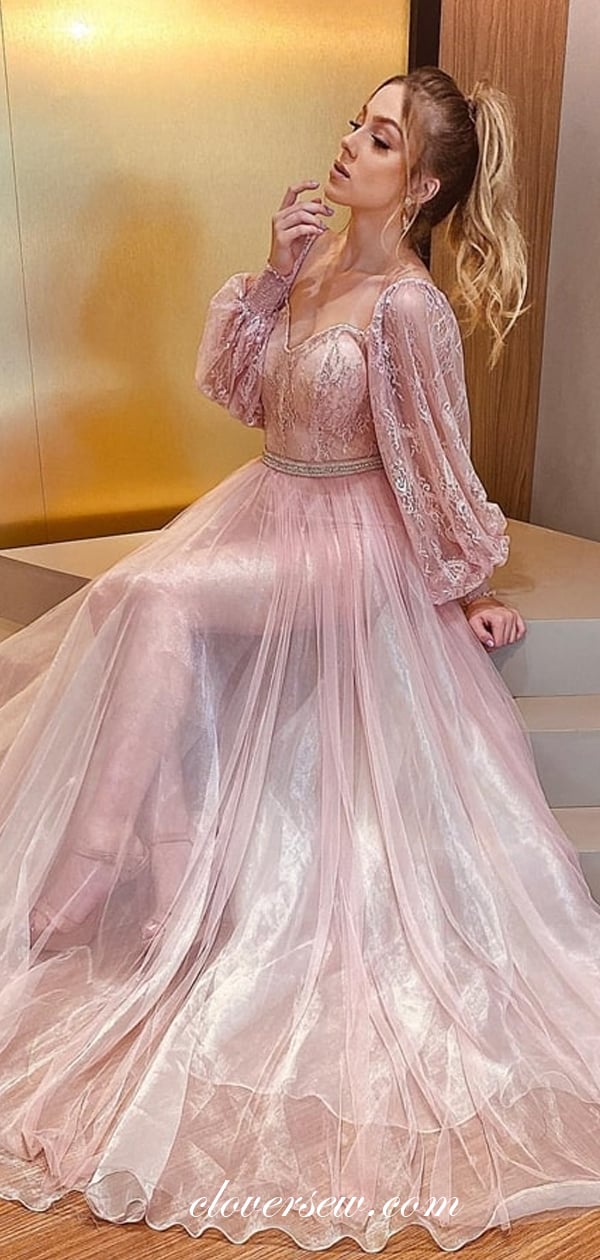 Pink Organza Prom Dresses,Long Sleeves Prom Dresses,Shiny Party Dresses,CP0054