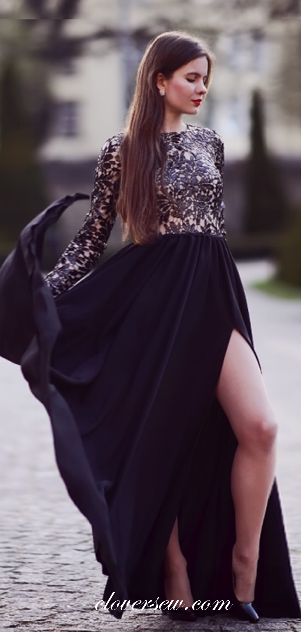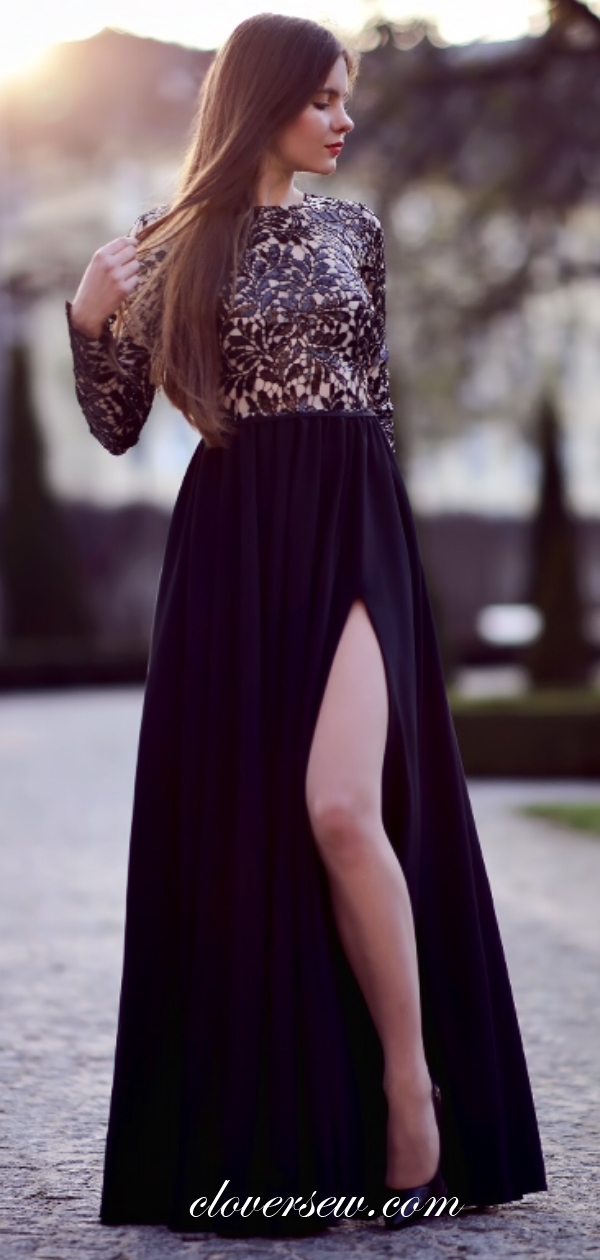 Black Lace Prom Dresses,Long Sleeves Prom Dresses,Elegant Prom Dresses,CP0058