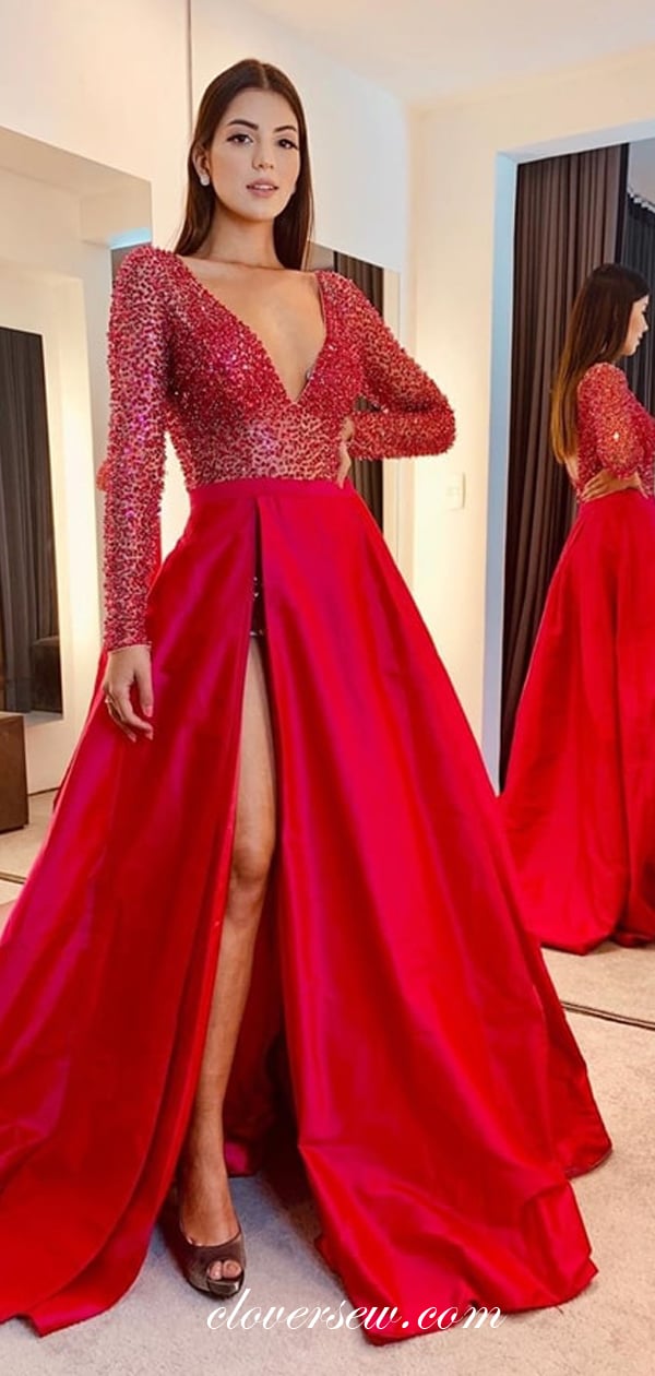 Red Prom Dresses,Long Sleeves Prom Dresses, V-neck Prom Dresses,CP0064