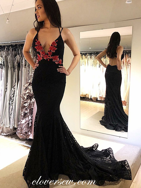 Black Lace Prom Dresses,Open Back Prom Dresses, Mermaid Prom Dresses,CP0073