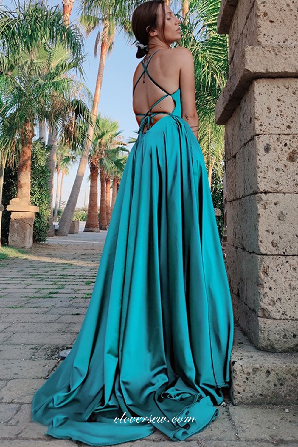 Turquoise Lace Up Back Prom Dresses,A-line With Slit Prom Dresses,Charming Beach Party Dresses,CP0100