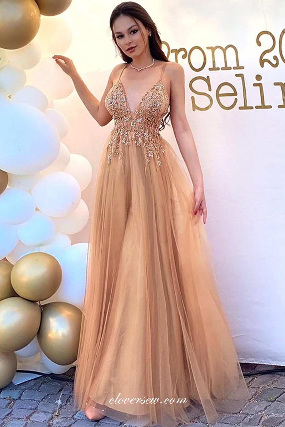 Champagne Gold Lace Tulle Prom Dresses,A-line Elegant Prom Dresses,Charming Party Dresses,CP0101