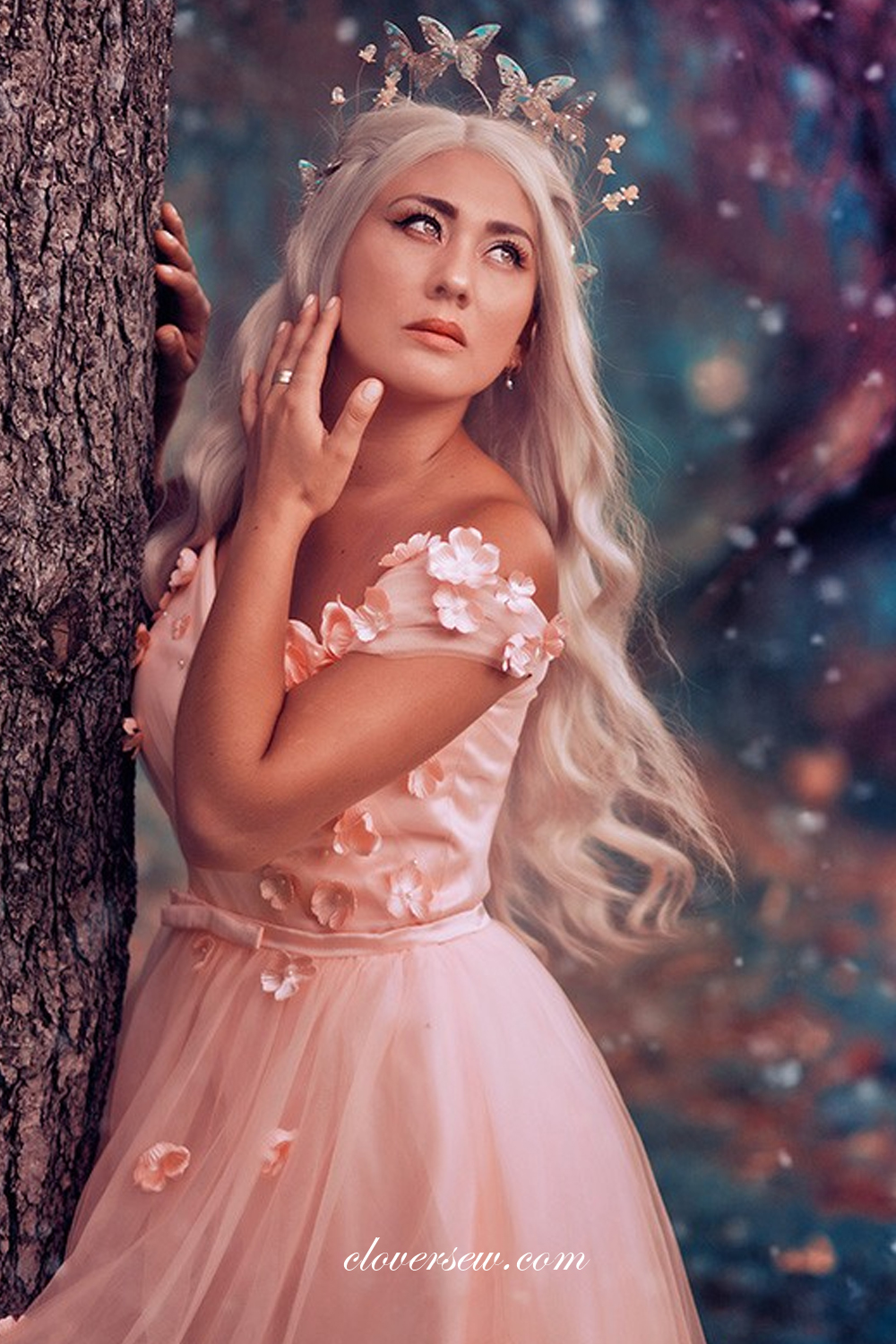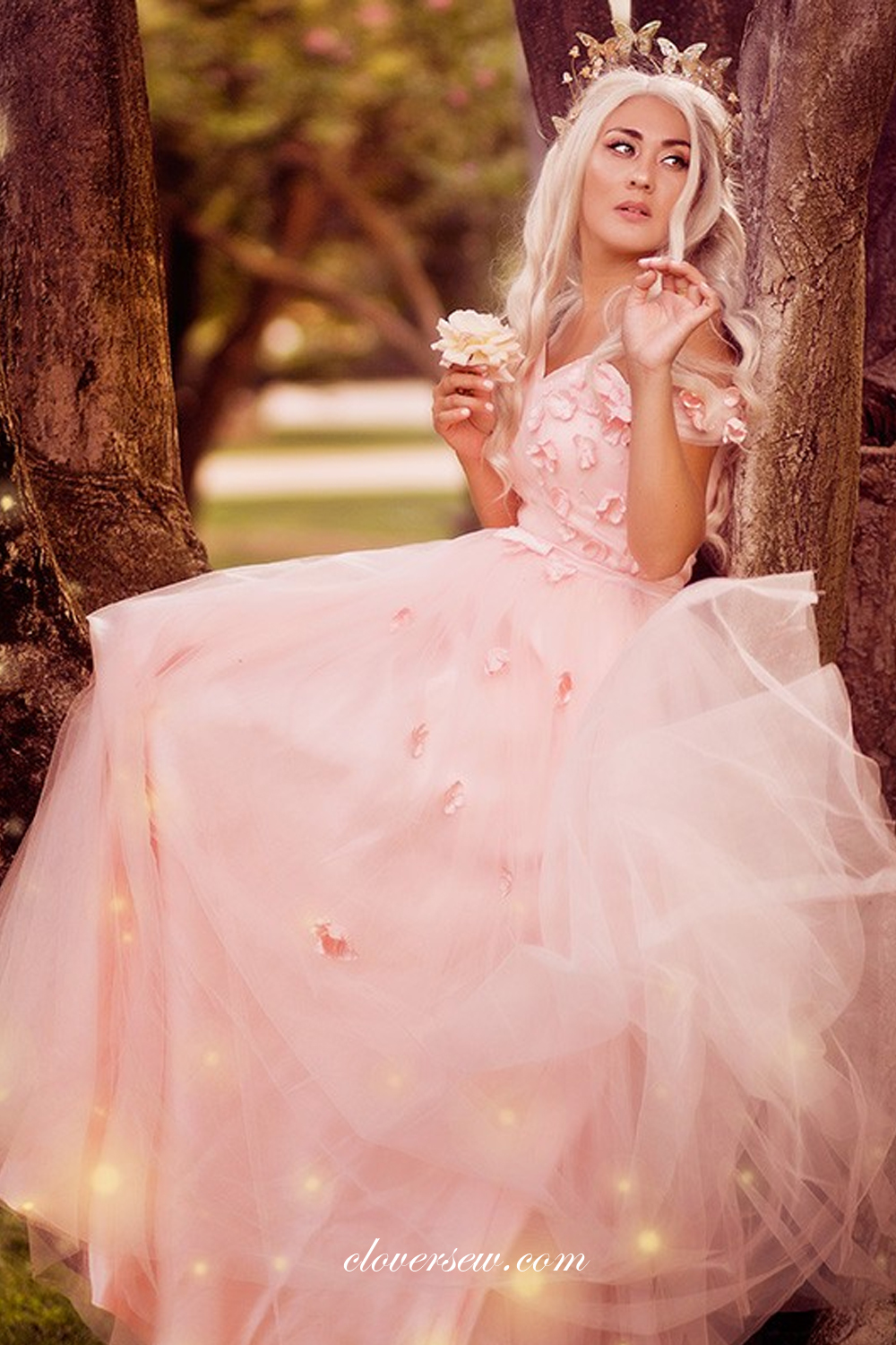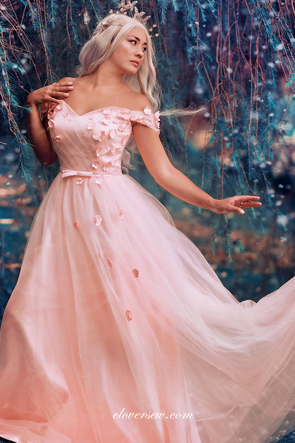 Pink Prom Dresses,3D Flower Applique Party Dresses,Off The Shoulder Prom Dresses,CP0103