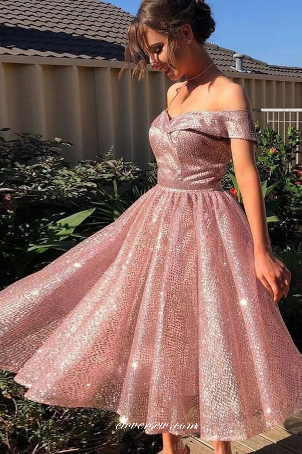 Pink Sequin Tulle Prom Dresses,Short Homecoming Dresses,Off The Shoulder Occasion Dresses,CP0122