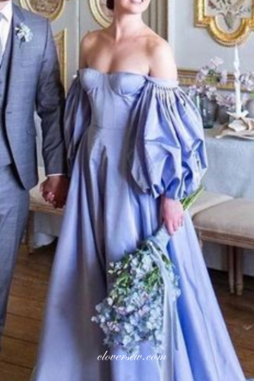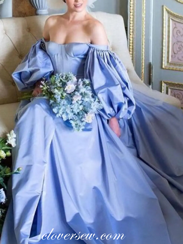 Off The Shoulder Blue Satin Wedding Dresses,Puffy Sleeves Wedding Dresses,Charming Wedding Dresses,CW0067