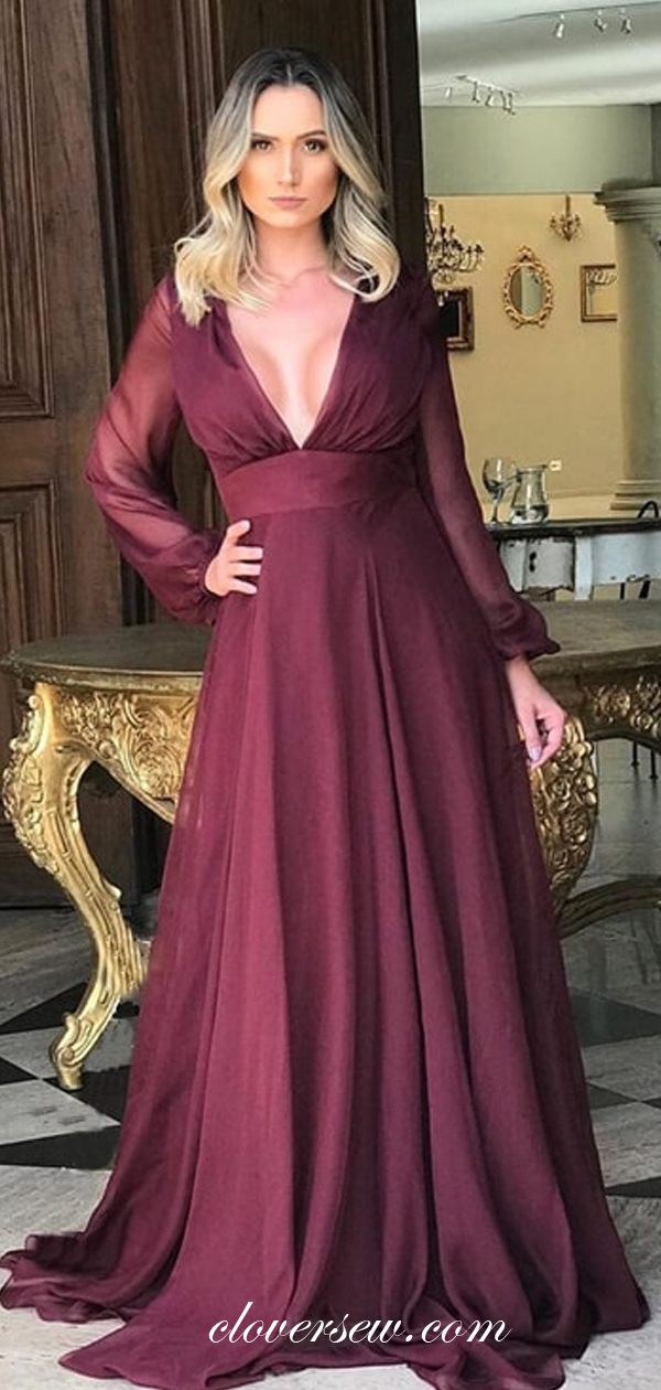 Maroon Evening Dresses,Long Sleeves Evening Dresses,V-neck Formal Dresses,CP0131