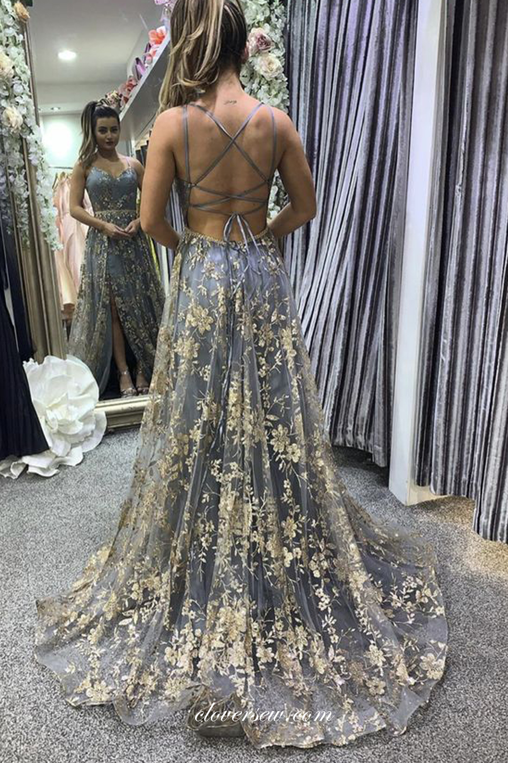 Gold Glitter Lace Tulle Prom Dresses,Charming Long A-line Prom Dresses,Fashion Prom Dresses,CP0135