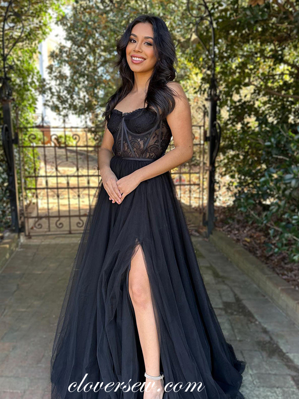 Black Lace Tulle Prom Dresses, Sweetheart Stapless Prom Dresses,A-line With Slit Prom Dresses,CP0154