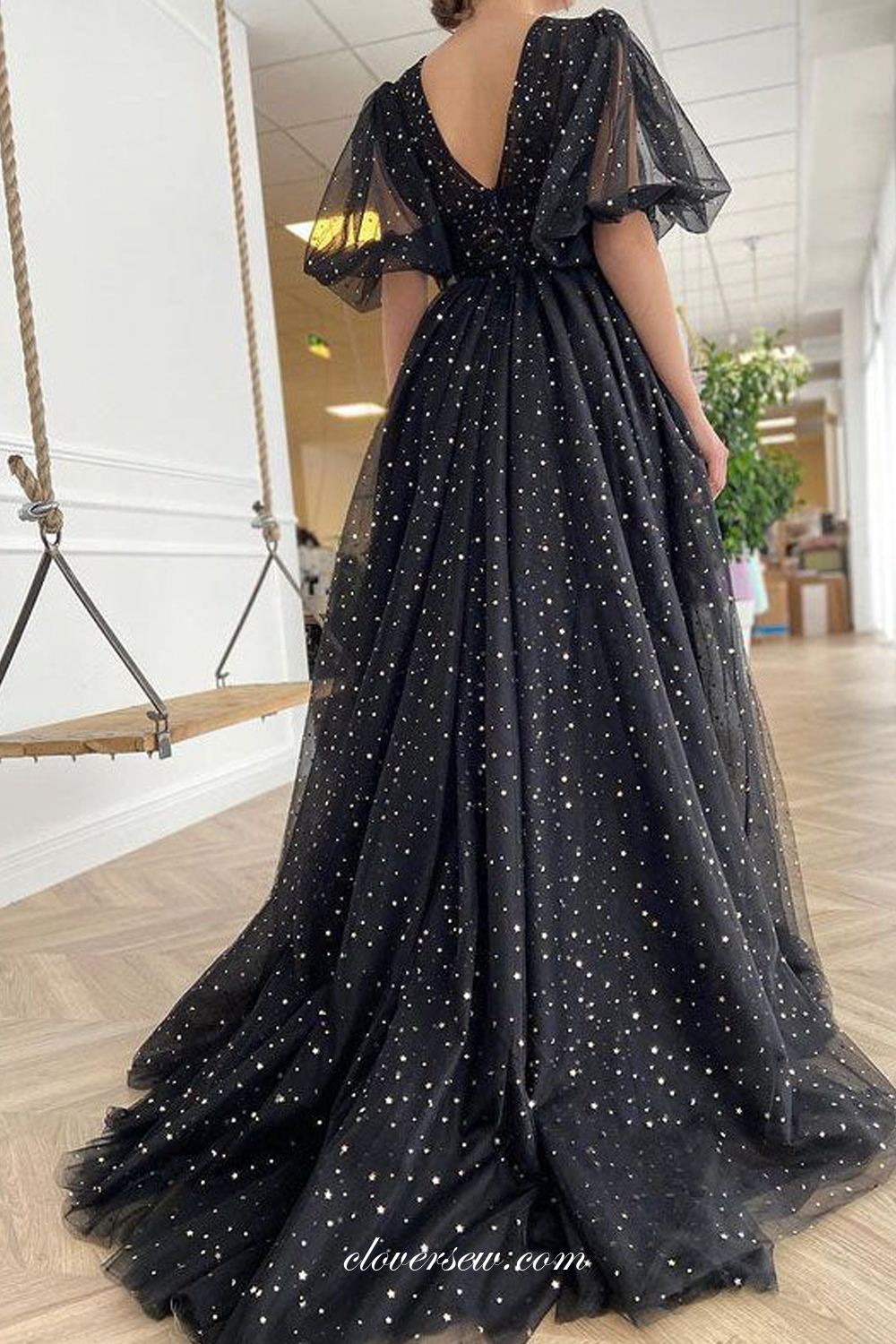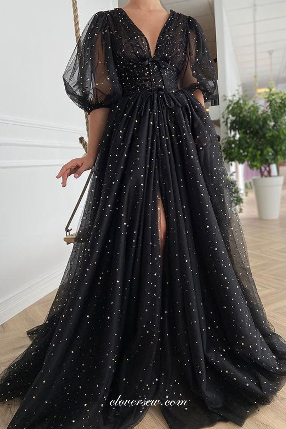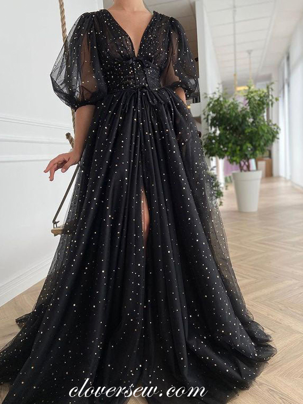 Black Glitter Tulle Prom Dresses, Half Sleeves Prom Dresses,A-line With Side Slit Prom Dresses,CP0163