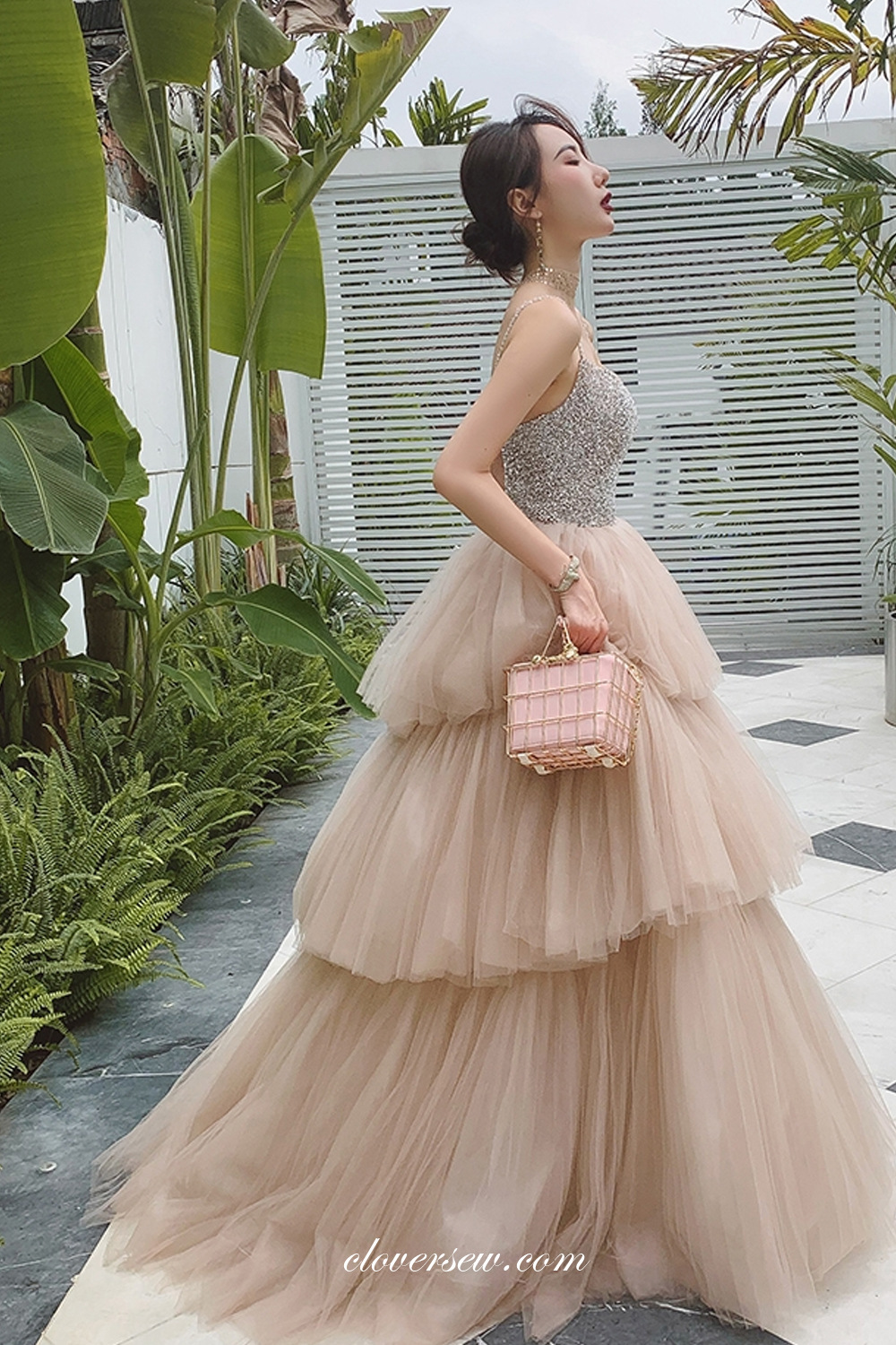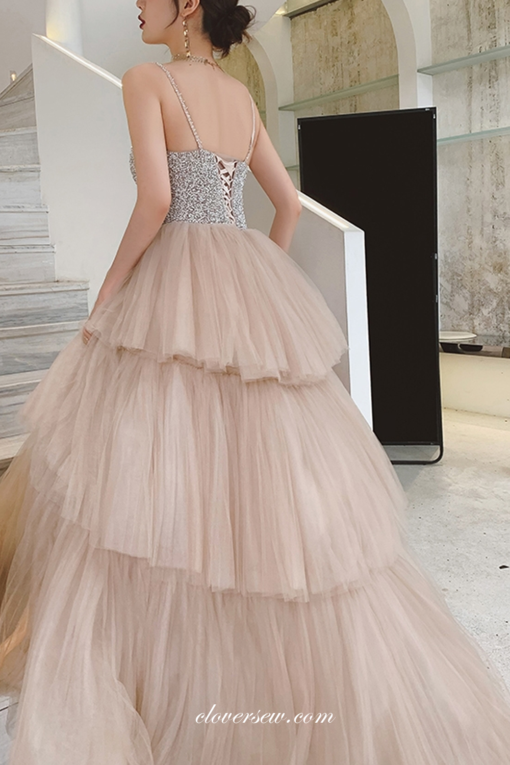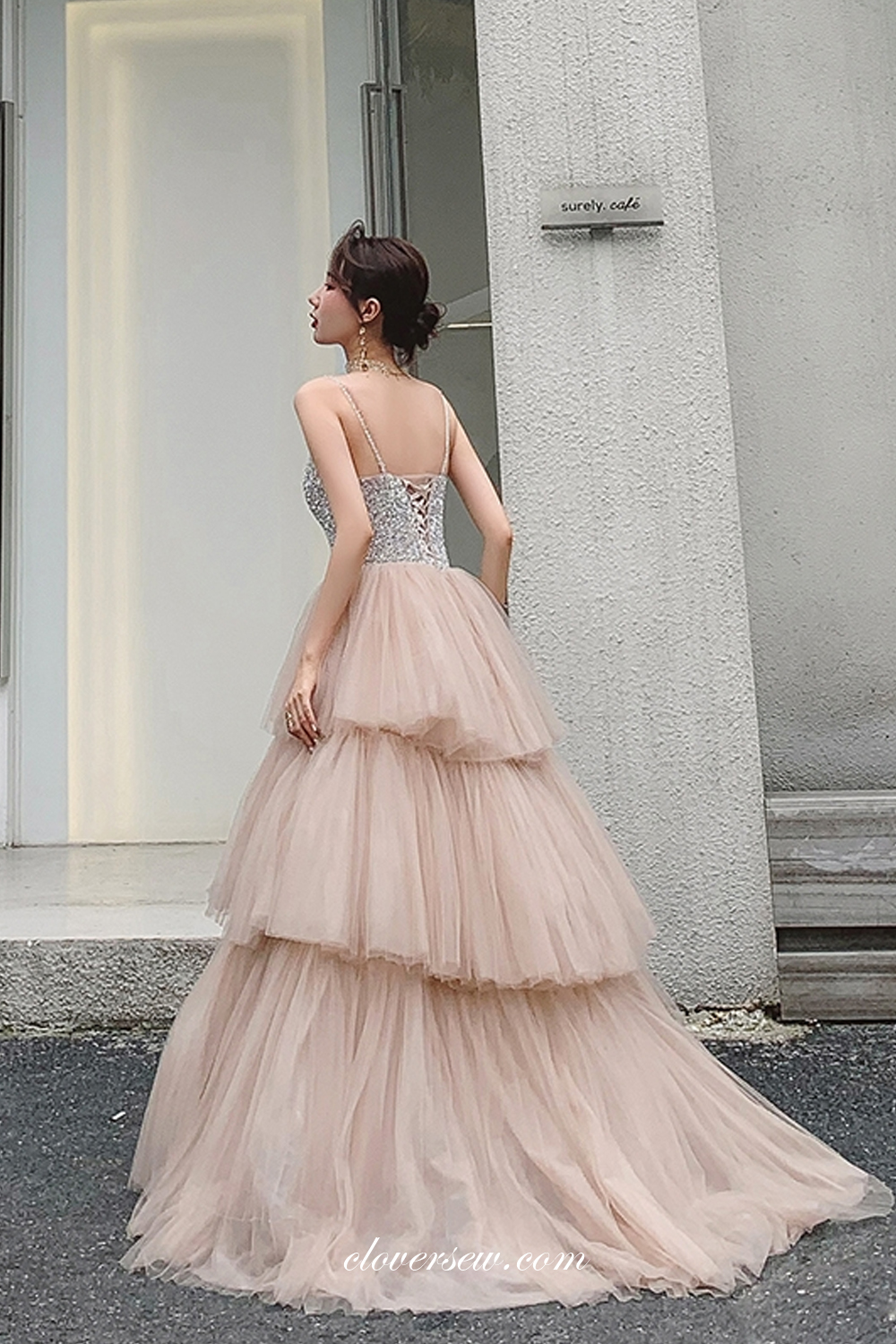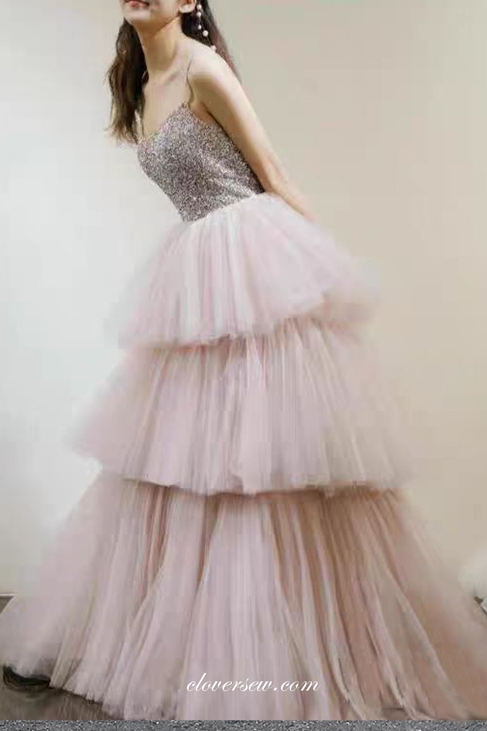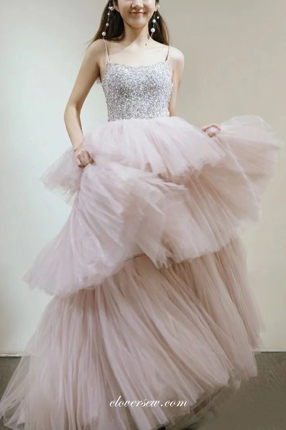 Silver Beads Pink Tulle Prom Dresses,Tiered Ball Gown Prom Dresses, Sparkly Evening Dresses,CP0171