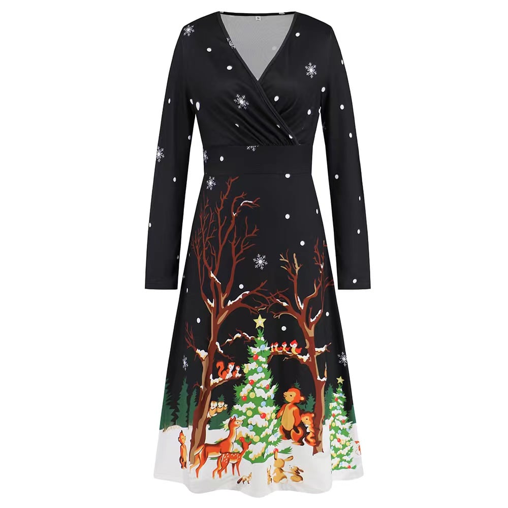 Christmas Dress, Printed Dress, Long Sleeves Dress,Black Dresses,Reindeer