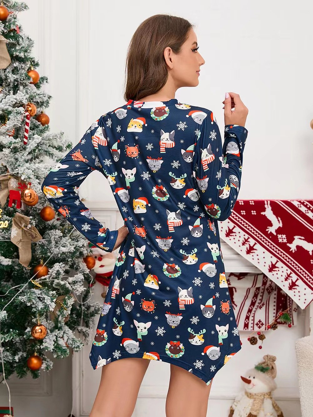 Christmas Printed Dress, Short Dress, Long Sleeves Dress, Navy Animal