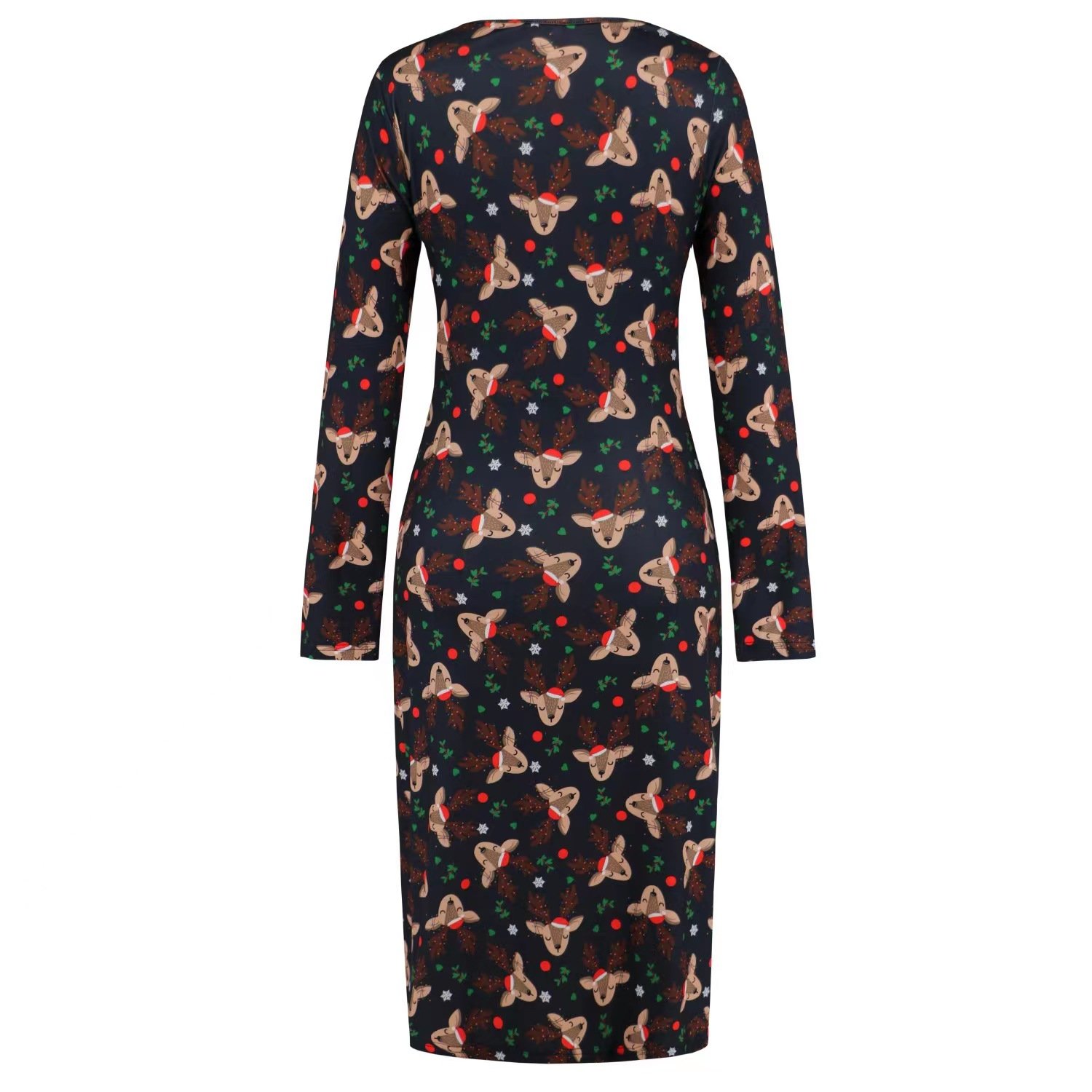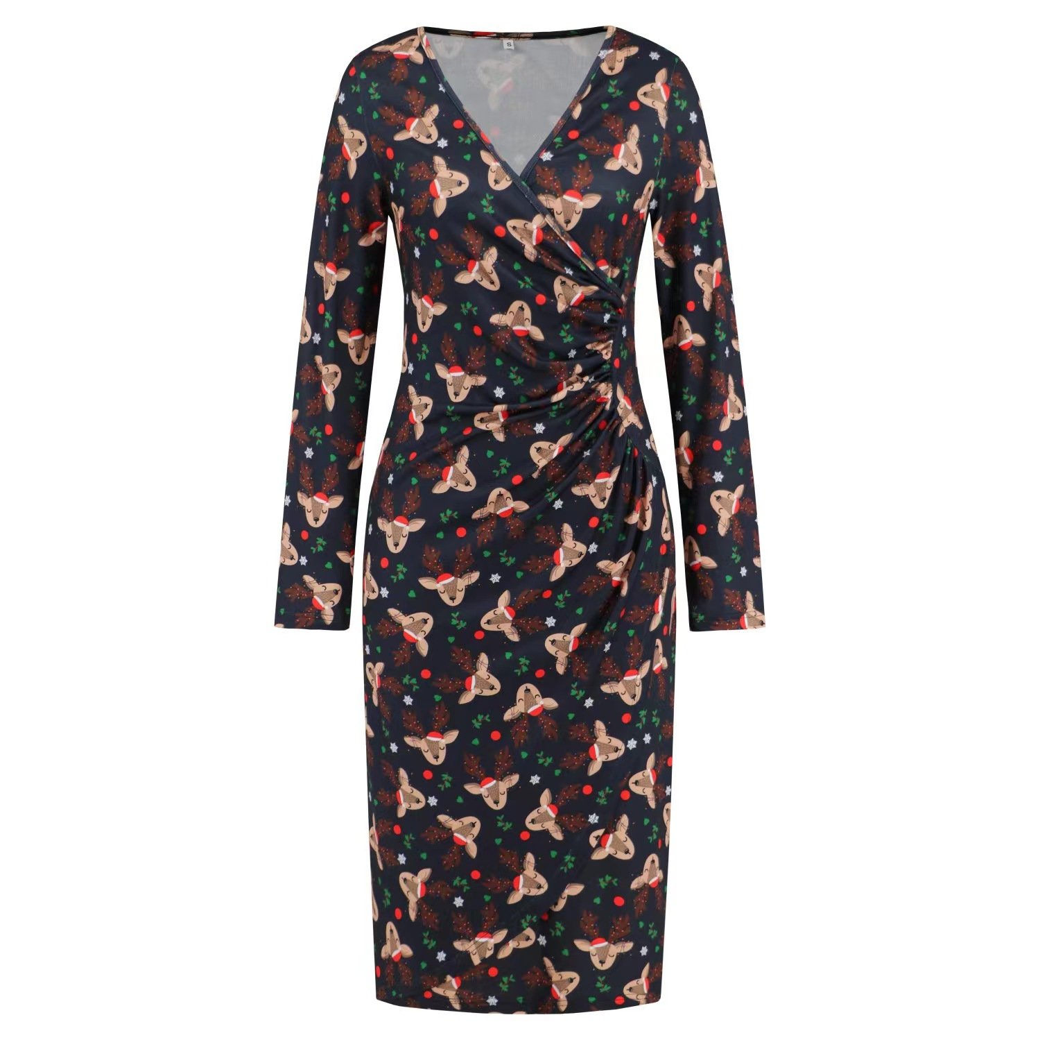 Christmas Printed Dress,V-neck Dresses, Long Sleeves Dress,Black Christmas Reindeer