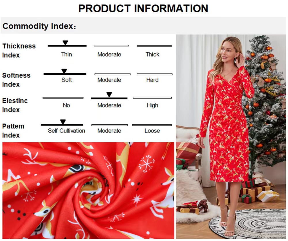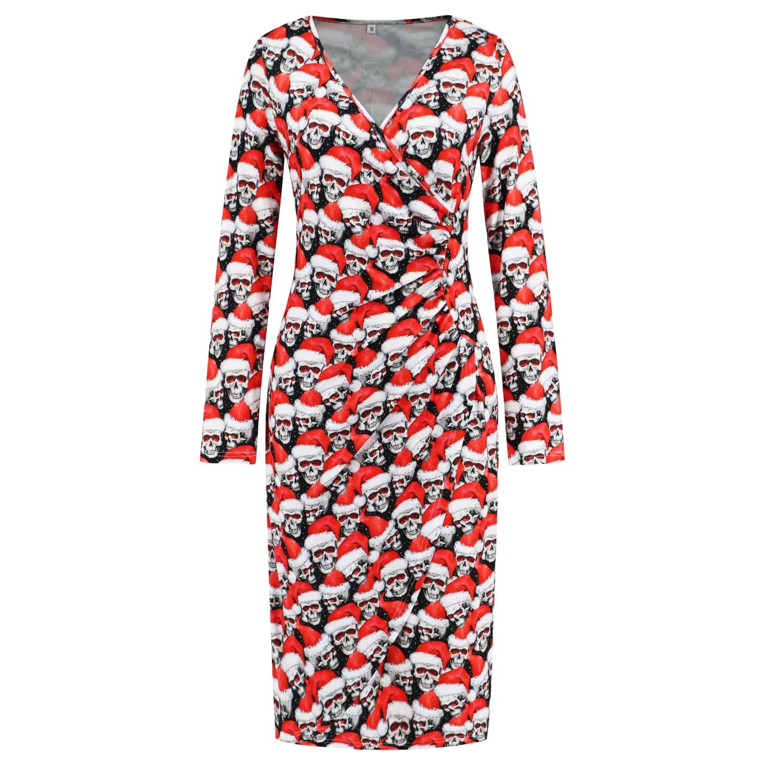 Christmas Printed Dress,V-neck Dresses, Long Sleeves Dress,Red Christmas Hats