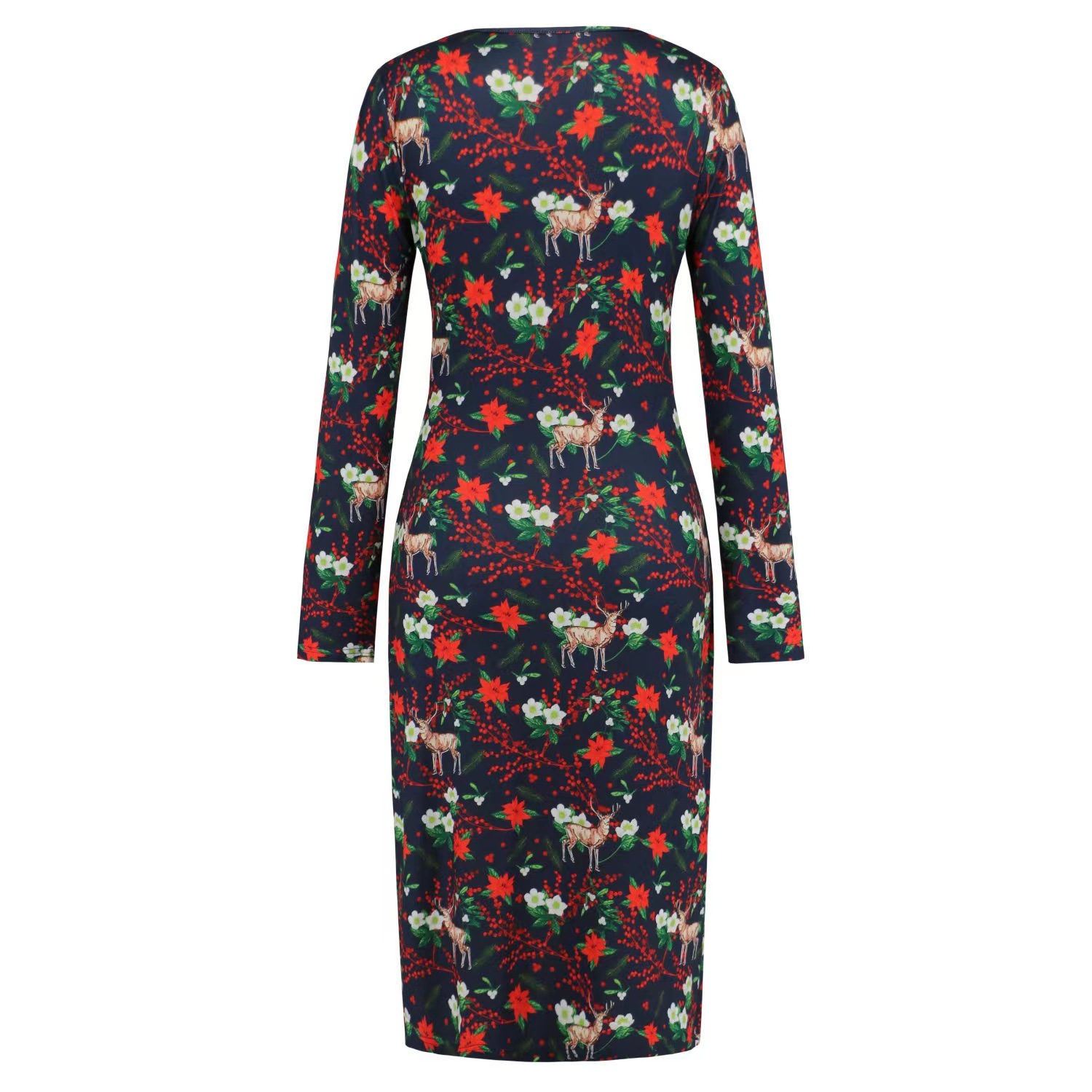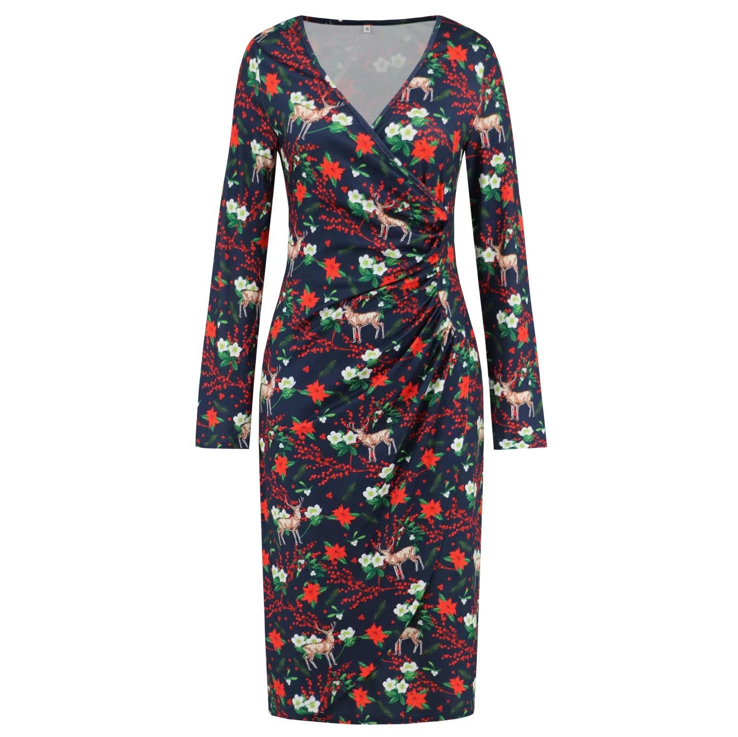 Christmas Printed Dress,V-neck Dresses, Long Sleeves Dress,Black Reindeer